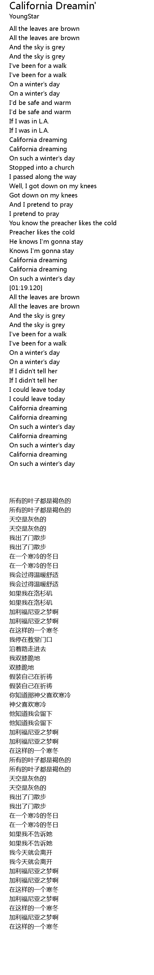 California dreamin on such a winters day. California dreamin oh yeah you know that we just chasing dreams chasing dreams california dreamin oh yeah oh oh oh oh oh oh oh oh oh oh oh gotta get your sunshine oh oh oh oh oh oh oh oh oh oh oh california dreamin now im sending all the love thats inside my soul all across the globe lets see where it goes. All the leaves are brown all the leaves are brown and the sky is gray and the sky is gray ive been for a walk ive been for a walk on a winters day on a.
